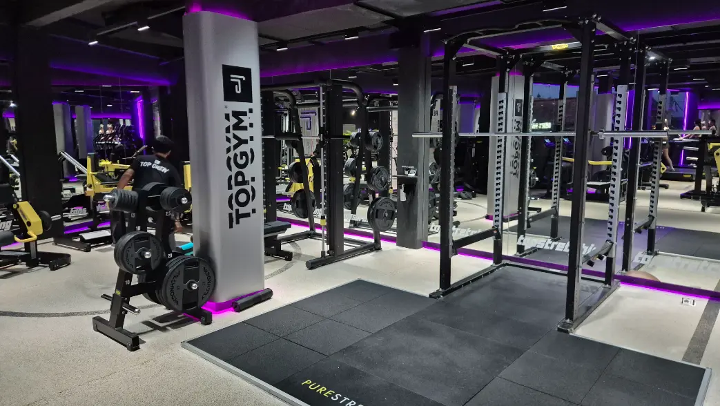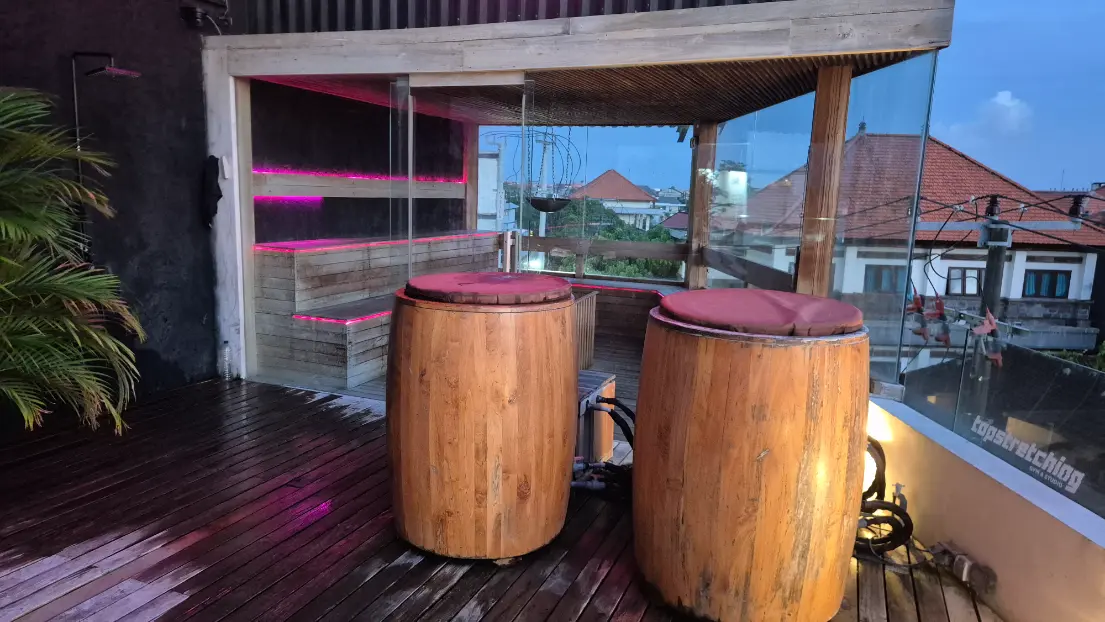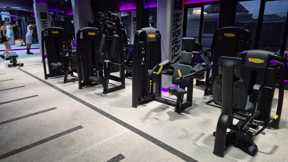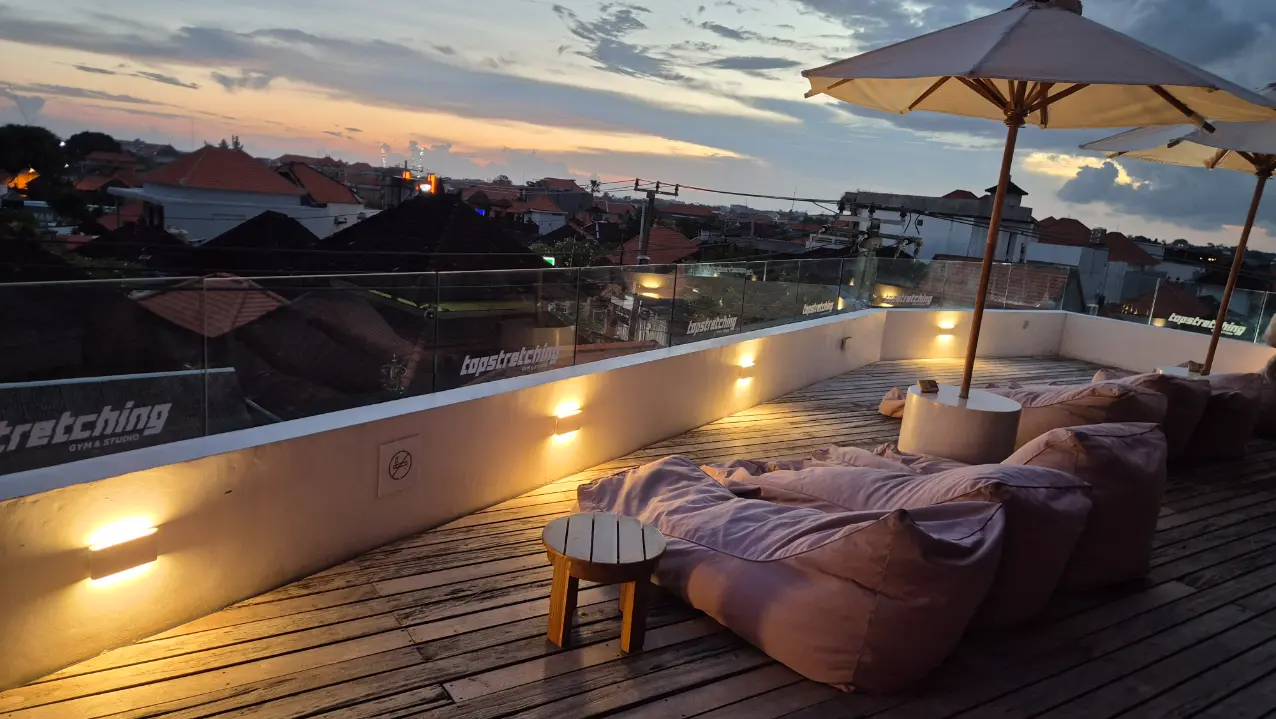TOPGYM Canggu is a modern 900m² fitness space located in the heart of Canggu on Batu Bolong, close to cafes and the beach. The gym offers premium Technogym equipment, functional training zones, stretching areas, and a rooftop space. Members can join group classes like HIIT, aero, and TRX, or book a sports massage. Recovery facilities include a panoramic sauna and two ice baths. A protein bar, sunbeds, and relaxed lounge areas complete the experience.